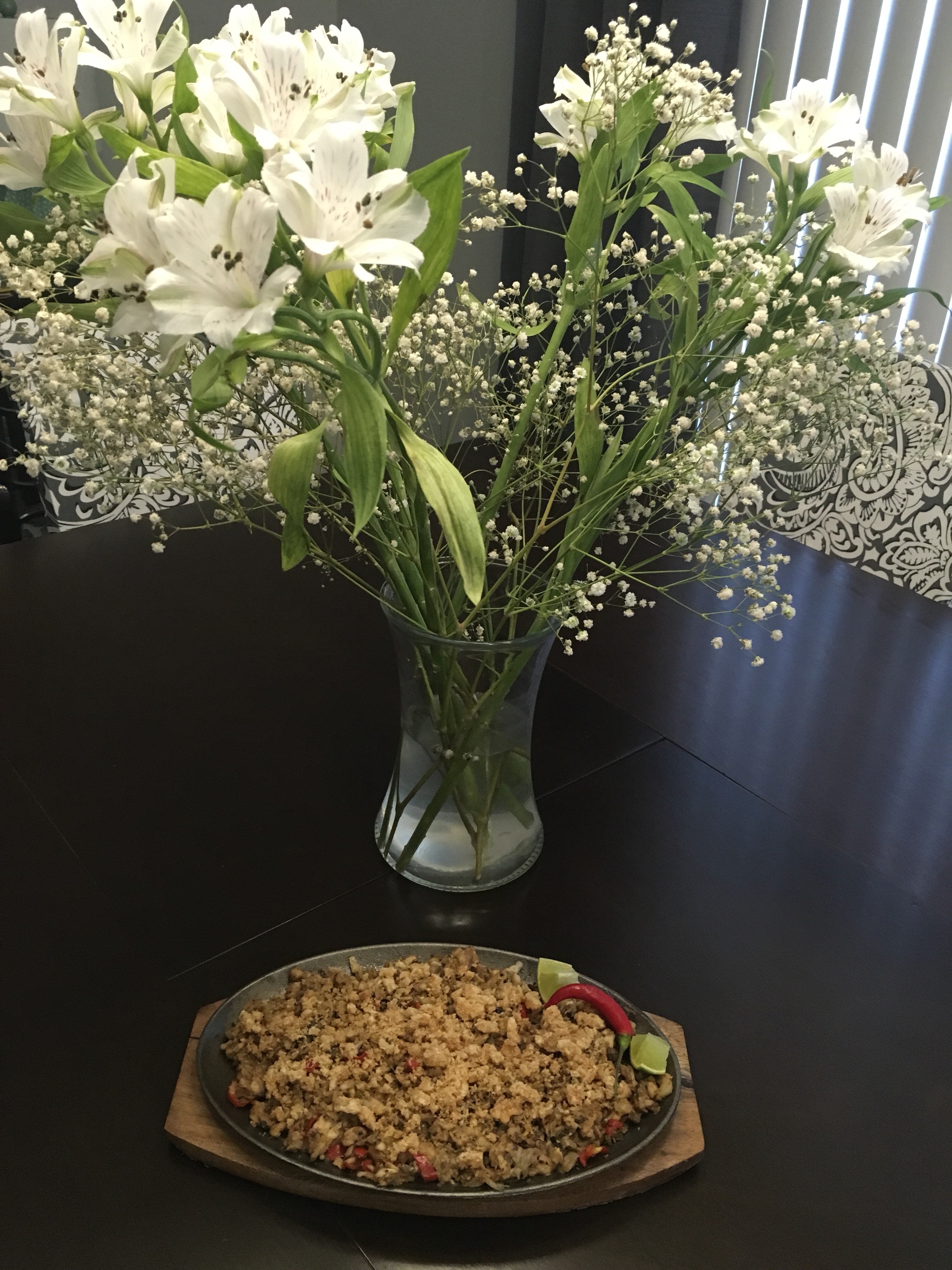 This is Filipino pulutan, food to be eaten while drinking beer or liquor. The traditional version uses pork cheeks, ears, chicken livers, egg, chill peppers, garlic and onions. The meats require a whole lot more prep and have lots of fat. This is lightened up with bangus (also called milkfish), but gets the same sizzling pan prep like fajitas. The fish is convection oven cooked, instead of fried. You can get the fish at an Asian grocery.It’s topped with crushed chicharron and served with a squeeze of lime. It comes in at 3 weight watcher points a serving. Have it with a San Miguel Light beer, cheers!